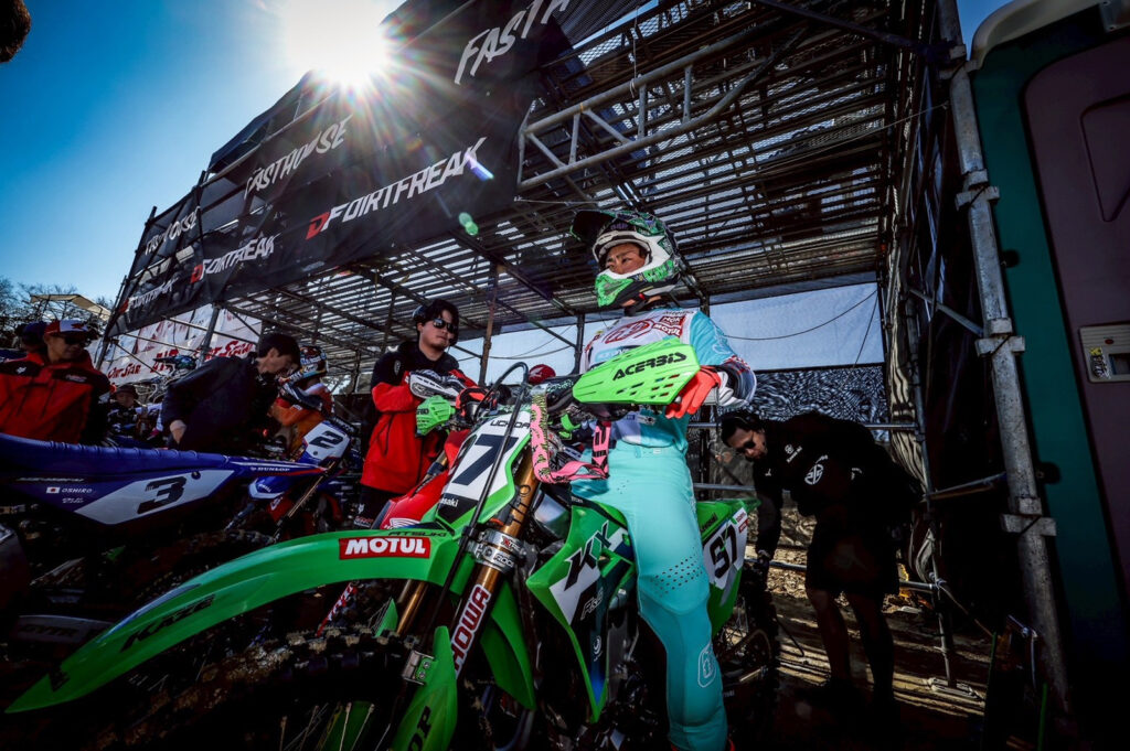 決勝では全てのヒートでスタートが決まりホールショット。しかし1、2ヒート目は直後に単独で転倒をしてしまい最後尾からの追い上げとなりました。